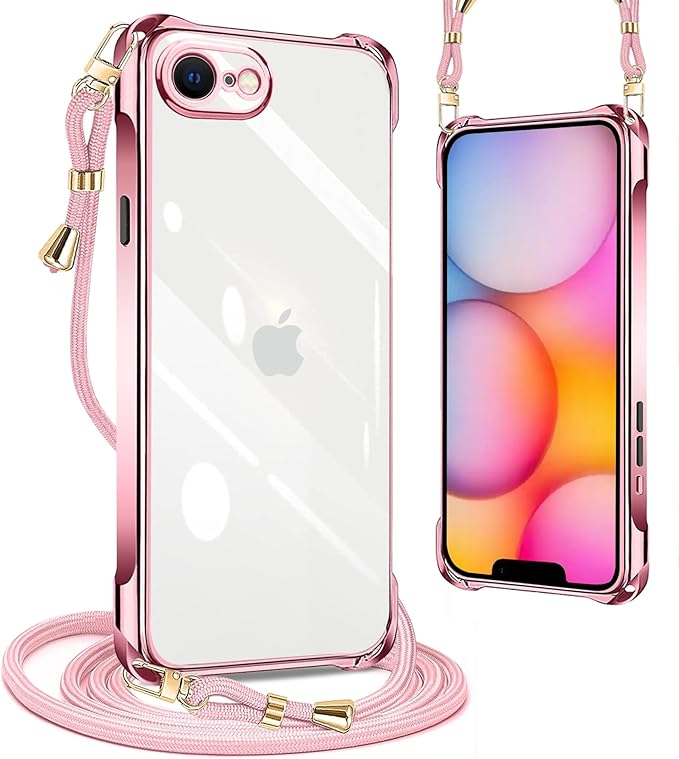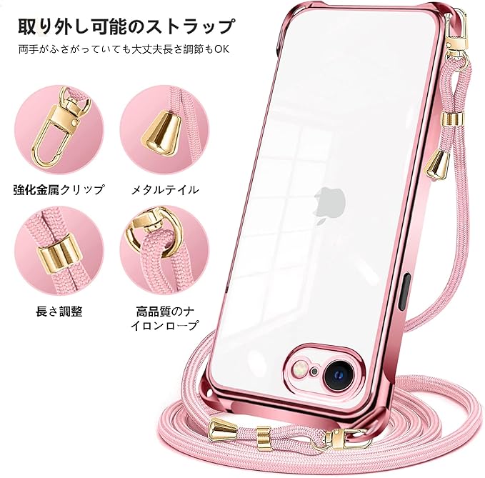 iPhone 16E ケース クリア ネック ショルダー 第4世代 耐衝撃 ストラップ付き iPhone 16e スマホケース アイフォン16e カバー 透明 TPU 薄型 軽量 スマホ シリコン カバー 紐付き 斜めがけ 織りストラップ付き 肩掛け 縦/横 2WAY 調節可能なショルダー クロスボディ 多目的キャリー ファッションデザイン(ローズゴールド)