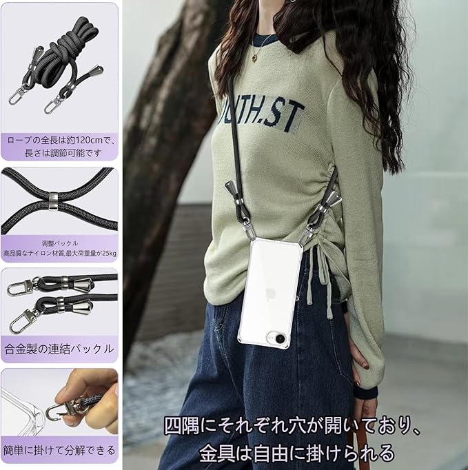 iPhone 16e ケース クリア ショルダー 耐衝撃 肩掛け あいふおん16eケース 首かけ 斜めがけ 縄掛け アイフォン16e カバー 調節可能な 透明 落下防止 縦/横 紛失防止 2WAY (ブラック)
