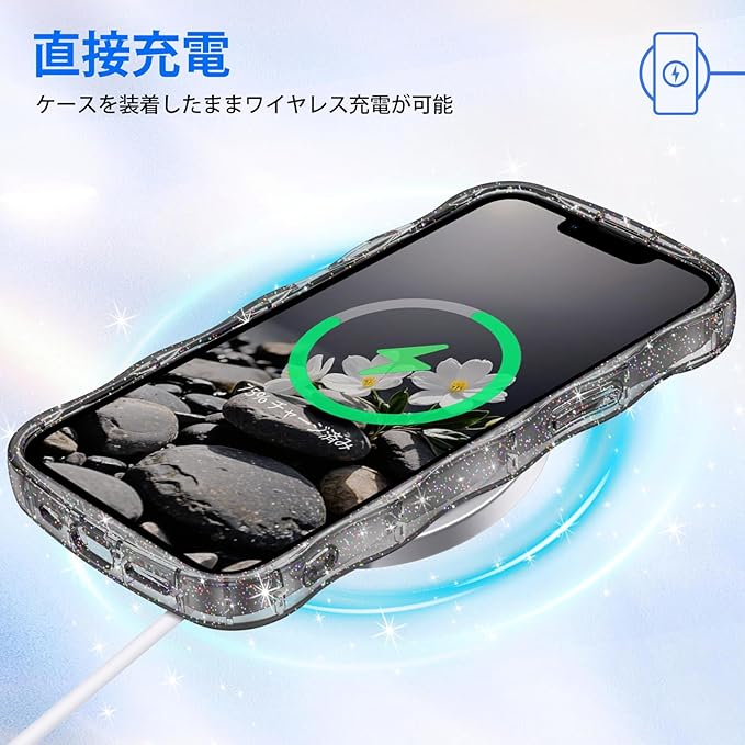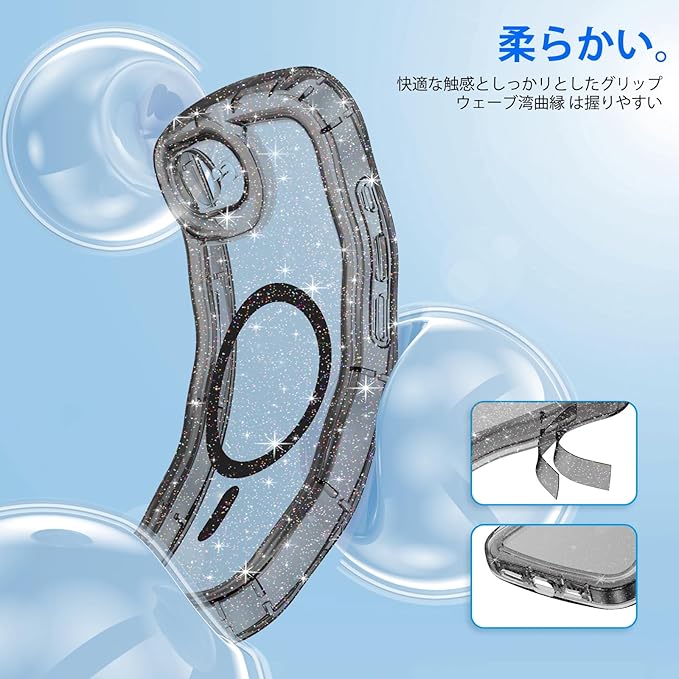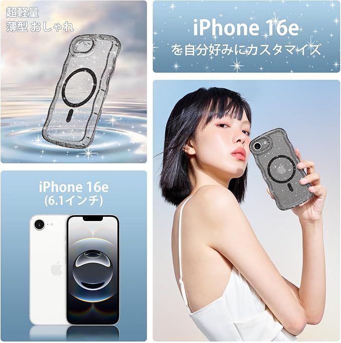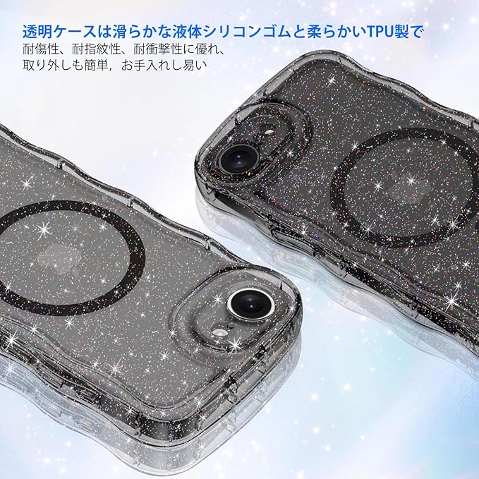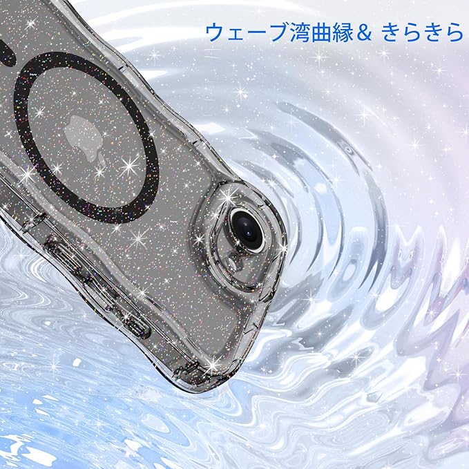 GUAGUA iphone 16e ケース クリア ウェーブ きらきら iphone 16E ケース 可愛い ワイヤレス充電 キラキラ あいふおん16e うねうね かわいい 透明 人気 韓国 耐衝撃 超軽量 薄型 おしゃれ 黄ばみなし スマホケーアイフォン 16E 米軍規格 耐衝撃 マグセーフ リング マグネット搭載 あいほん16E なみなみ カバー(くろ+キラキラ)