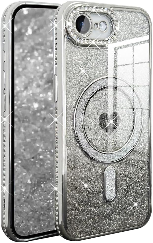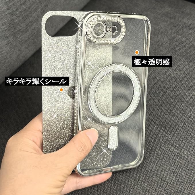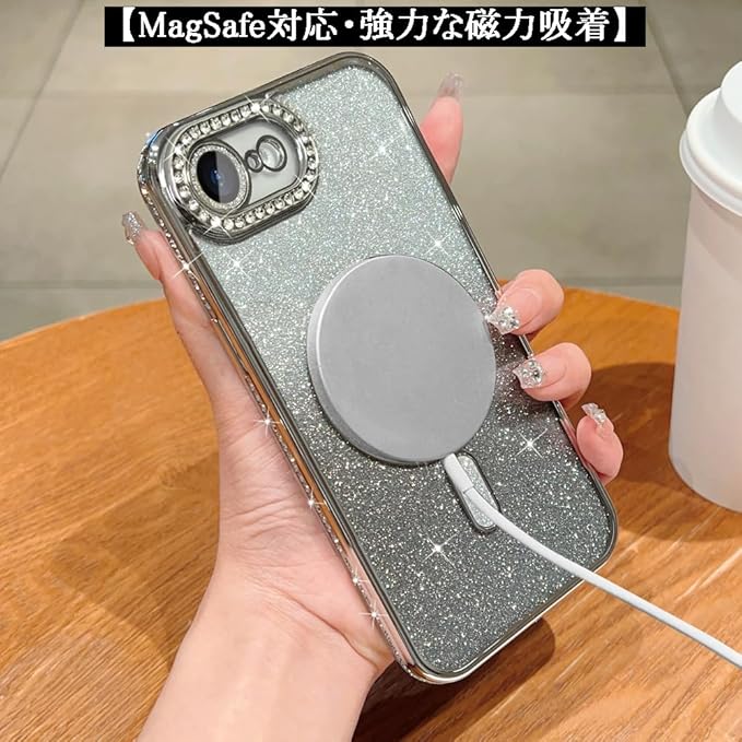 スマホケース 対応 iPhone 16e ケース MagSafe対応 クリア メッキ加工 ドリル ハートシール きらきら ブリンブリン かわいい おしゃれ 軽量 薄型 衝撃吸収 女性 ストラップ穴あり アイフォン16e 磁気ケース (シルバー, iPhone 16e)