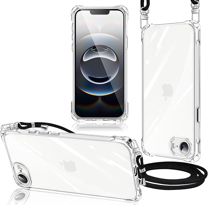 iPhone 16E ケース クリア ショルダー 縄掛けケース 耐衝撃 アイフォン16E スマホケース 透明 薄型 軽量 TPU カバー 肩掛け 斜めかけ 紐付き 織りストラップ付き 長さ調整可能 取り外し可能 落下防止 紛失防止 ワイヤレス充電対応 (クリア)