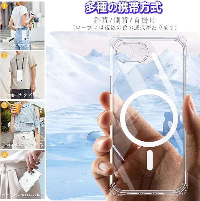 iPhone 16e 用 ケース クリア ショルダー MagSafe対応 アイフォン16e スマホケース iphone 16e カバー 肩掛け 斜めかけ 縄掛けケース 透明 TPU 携帯ケース 紐付き 織りストラップ付き 長さ調整可能 取り外し可能 紛失防止 落下防止 ワイヤレス充電対応(シルバー)