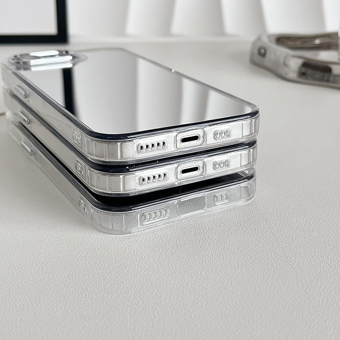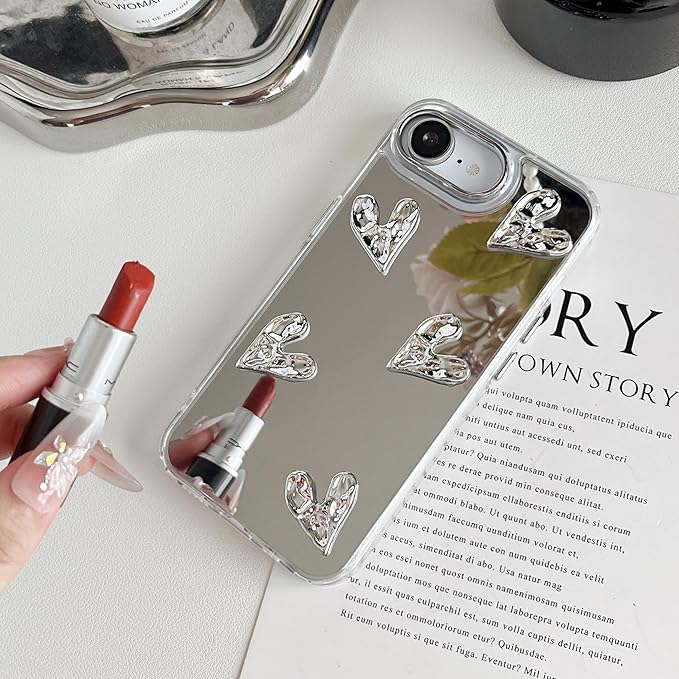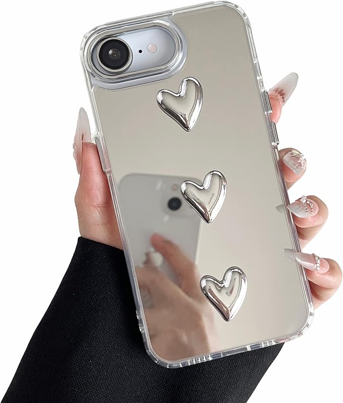ZTOFERA iPhone 16e ケース用、かわいい3Dハートミラーガールズ女性メイク電話カバー 、シルバーハート型透明iPhone 16eスマホケース用、3つの心