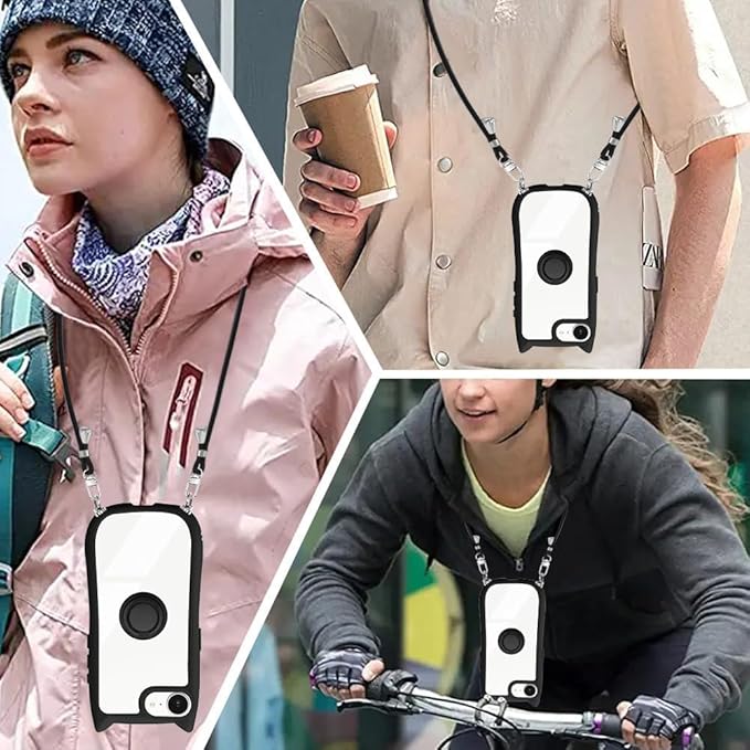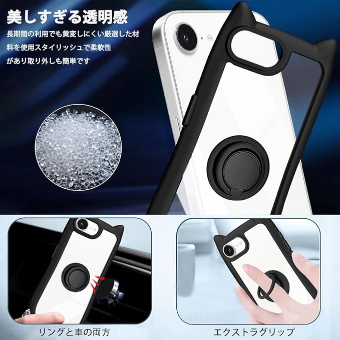 iPhone 16E ケース ショルダー クリア カバー リング付き 隠しスタンド 猫耳 ネコミミ 背面ガラス かわいい おしゃれ スタンド付き ストラップホール アイフォン16e スマホケース 多機能 全面保護 落下防止(ブラック)