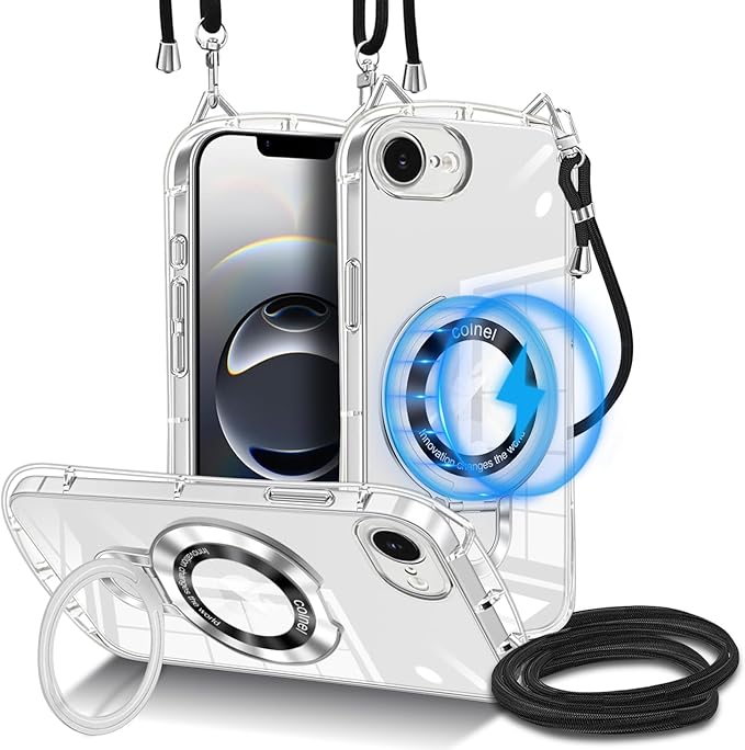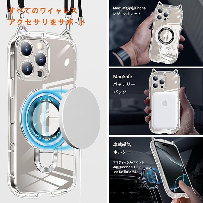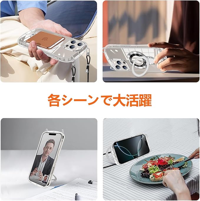 iPhone 16e クリア ケース 可愛らしくシンプル 猫耳にストラップ穴付き Magsafe 対応 ワイヤレス充電対応 iPhone13 ケース 薄型 軽量 ストラップ 長さ調節可能 車載対応 120 回転スタンド 縦横視聴対応 フル保護 黄変防止 落下防止 両手を解放