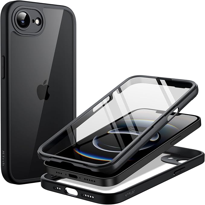 JETech iPhone 16e 6.1インチ 2025用 ケース 強化ガラスフィルム内蔵 360度フルボディ 耐衝撃 フォンカバー 耐久性の高い保護 クリアバック (ブラック)