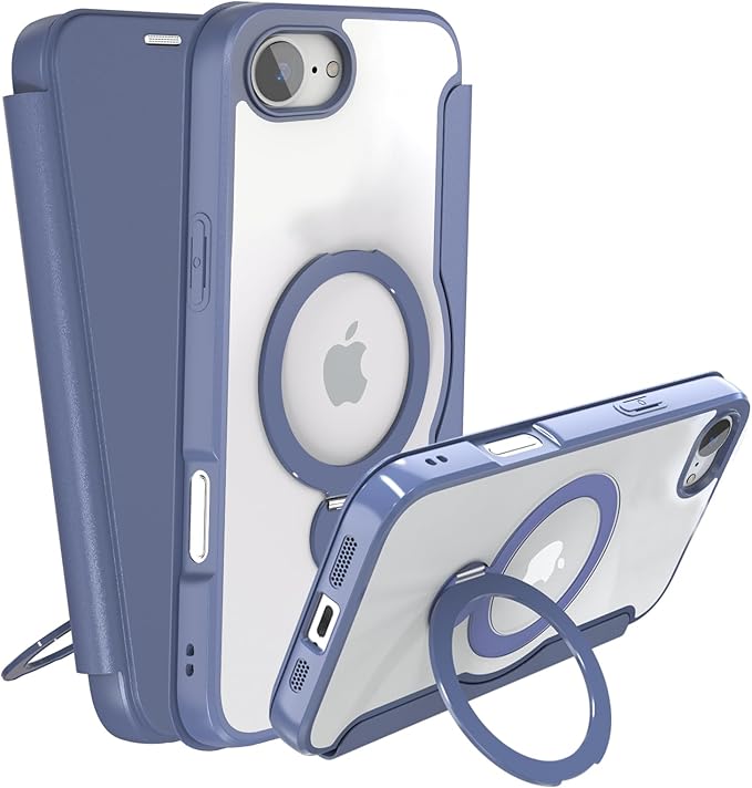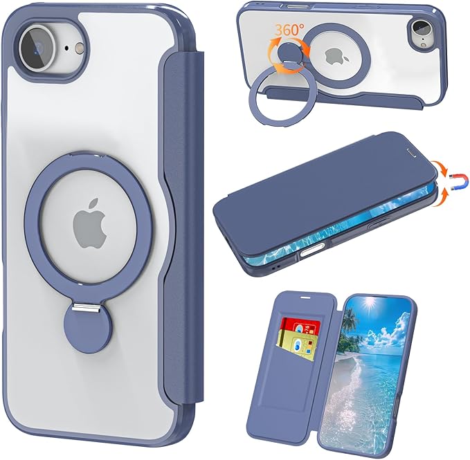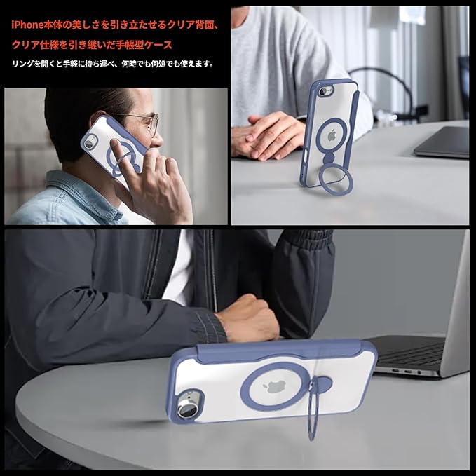 iPhone 16e 用 ケース 手帳型 カード収納 背面クリア MagSafe対応 リング付き 360 回転スタンド軽い 薄型 耐衝撃 全面保護 縦横両対応 レザー素材 マグセーフ対応 おしゃれ 青