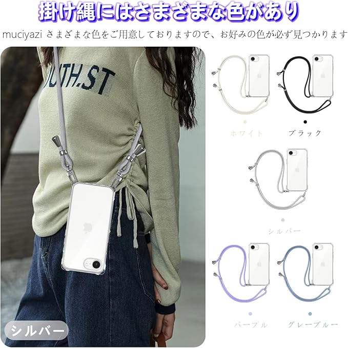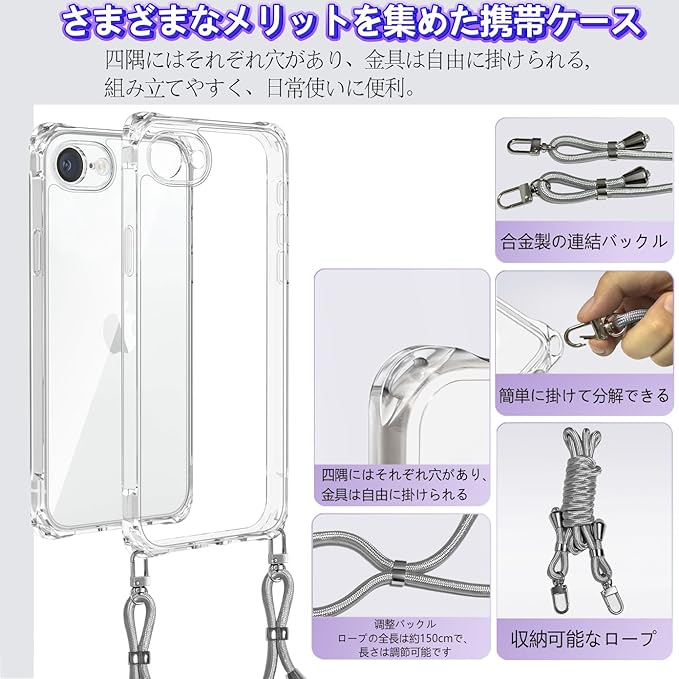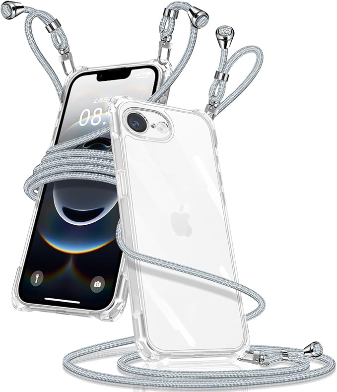 iPhone 16e 用 ケース クリア ショルダー iphone 16e スマホケース アイフォン16e カバー 肩掛け 斜めかけ 縄掛けケース 透明 薄型 軽量 TPU 携帯ケース 紐付き 斜めがけ 織りストラップ付き 長さ調整可能 取り外し可能 落下防止 紛失防止 ワイヤレス充電対応(シルバー)