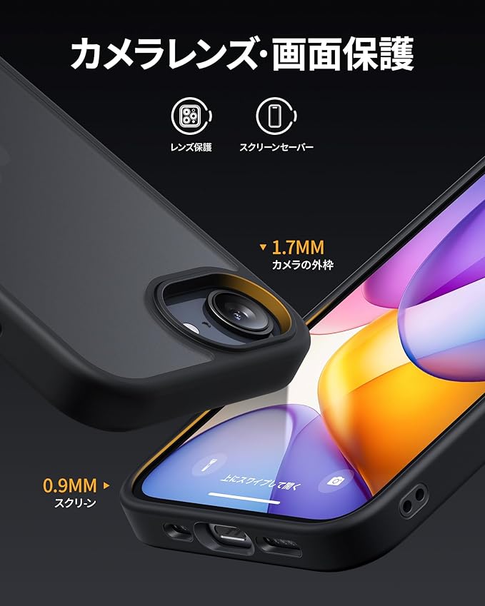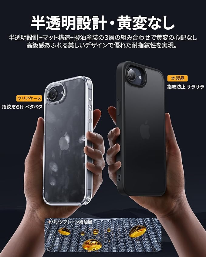 【半透明・マットな仕上げ】背面のポリカーボネートは、耐久性や耐摩耗性に優れ、マットな質感でサラサラして触り心地がすごく良いです。表面には指紋防止ナノオコーティングを施しており、指紋つく心配はありません。対応機種:iPhone 16e ケース