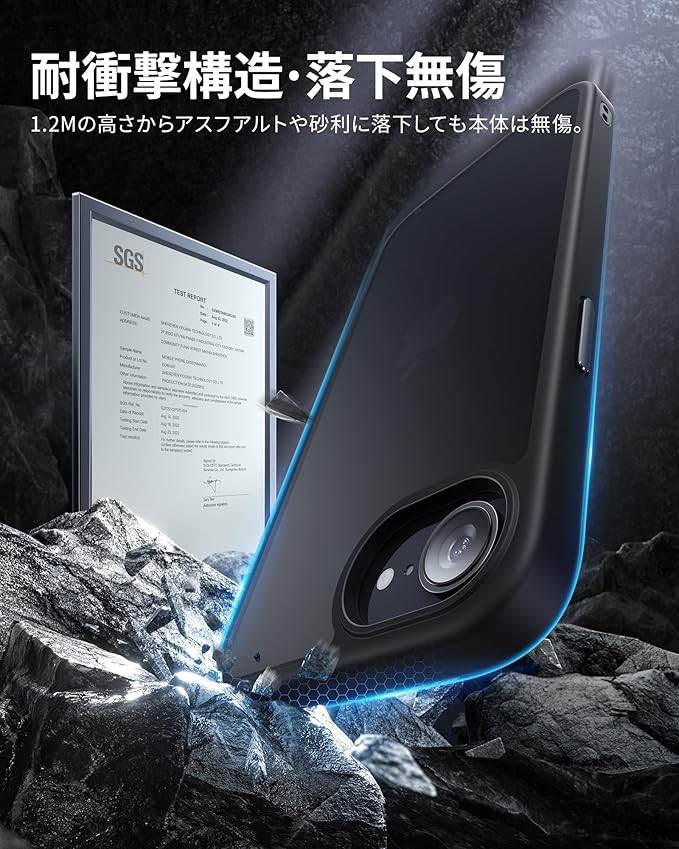 【米軍規格SGS認証・超強耐衝撃性】世界で有名な米国防総省が規定する米軍採用品規格「MIL-STD-810H」認証を取得済みです(認証番号:GZMR220802602301)。カバーの縁はiPhone 16eの液晶画面より0.9mm高く、カメラレンズより1.7mm高い、併用の保護ガラスフィルムを平置きしても、画面は接触しません。細部までの保護も配慮され、より一層な安心感を与えられます。コンクリートの地面に厚さ5mmの合板を敷き、高さ1.2mから合計26回、違う角度から落下させる実験をしましたが、本体に傷はつきませんでした。高い耐衝撃性を誇り、iPhone 16e を全方位からしっかりと守ります。