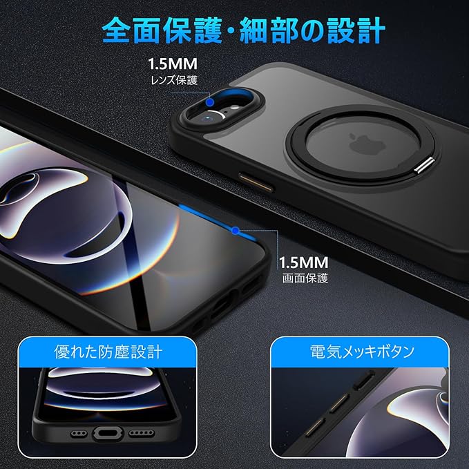 QUEASON【iPhone 16e 用 MagSafe対応 ケース】360 回転スタンド ワイヤレス充電対応 あいふおん16e ケース リング付き 米軍MIL規格 アイフォン16e ケース magsafe 超強磁力 落下防止 耐衝撃 半透明 防指紋(ブラック)