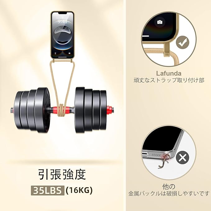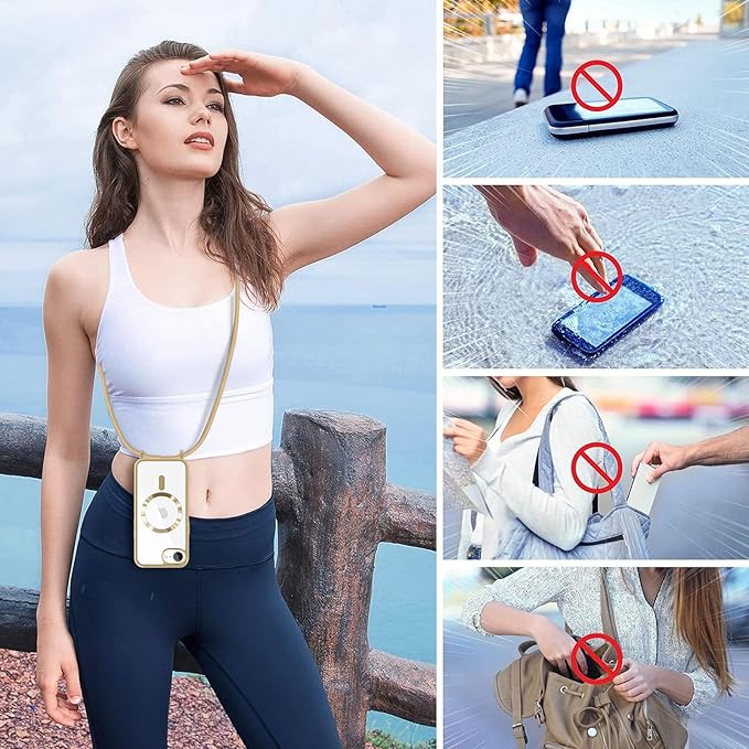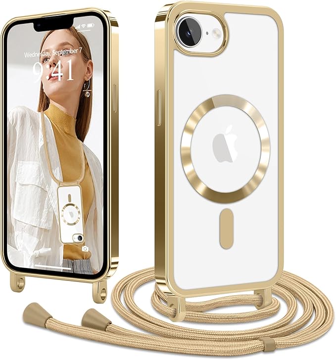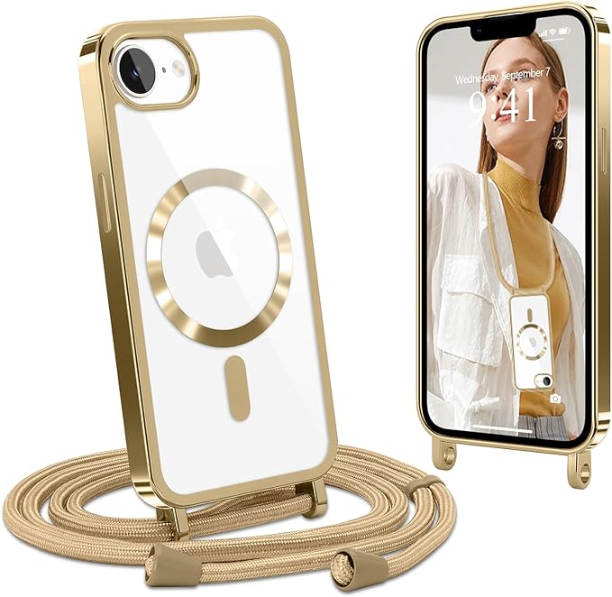 Lafunda iPhone 16e 用 ケース クリア MagSafe対応 ショルダー スマホカバー 透明 肩掛け 斜めかけ 縄掛け TPU 薄型 おしゃれ マグネット搭載 耐衝撃 落下防止 長さ調整可能 ワイヤレス充電 アイフォン 16e 用 携帯スマホケース ストラップ付き (ゴールド)