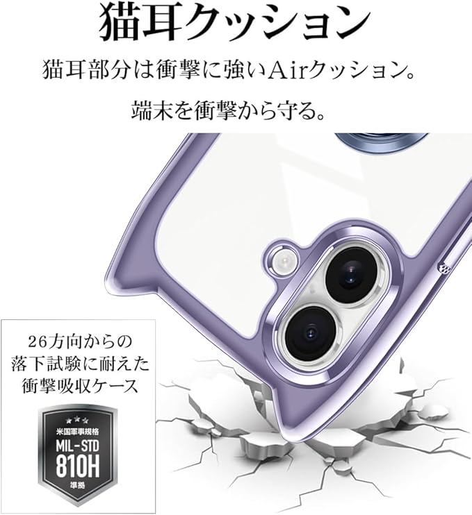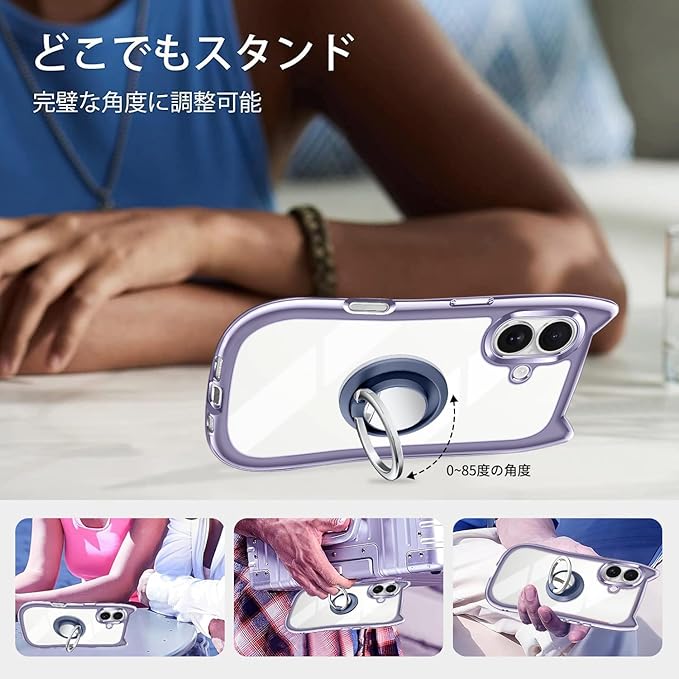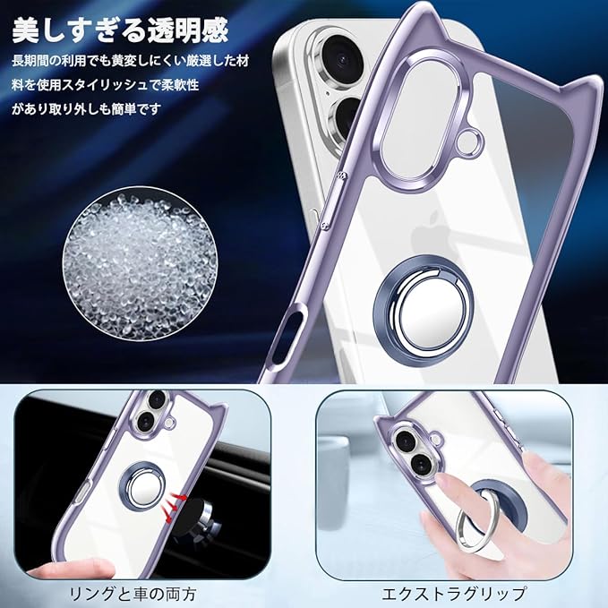 iPhone 16 ケース クリア カバー TPU 猫耳 リング付き リングホルダ かわいい おしゃれ スタンド付き ストラップホール アイフォン16 スマホケース 多機能 全面保護 落下防止(パープル)