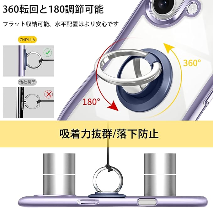 【リング付き機能】ケースを横置きにするとスタンド機能になり、持たず動画鑑賞などを楽しむことができます。リングは360度回転可能、185角度調節可能。一指着る式で、指がリングに通り抜け、片手で携帯を操作でき、落下防止します。