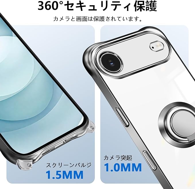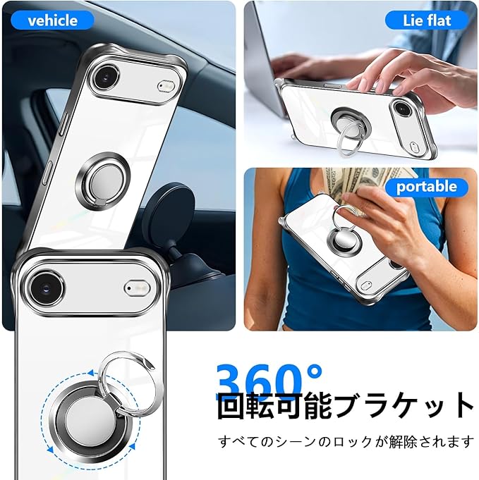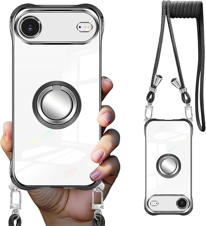 iPhone air ケース クリア 360度回転スタンド リング付き アイフォン air スマホケース 耐衝撃 対応 いphone air カバー 透明 TPU ネック ショルダー 肩掛け 斜めかけ 縄掛けカバー ストラップ付き 薄型 軽量 紐付き ネックストラップ ショルダー 肩掛け 縦/横 調整可能 取り外し可能 落下防止(ブラック)