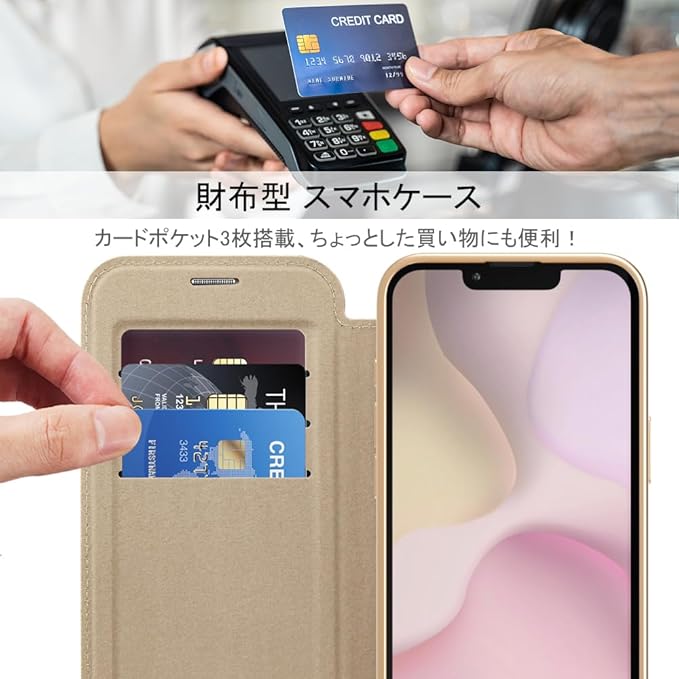 「カード収納」財布型ケースの内側には3つのカードポケットがつき、名刺や定期券の収納に優れているの手帳型ケースです。