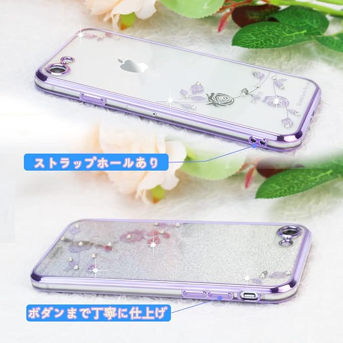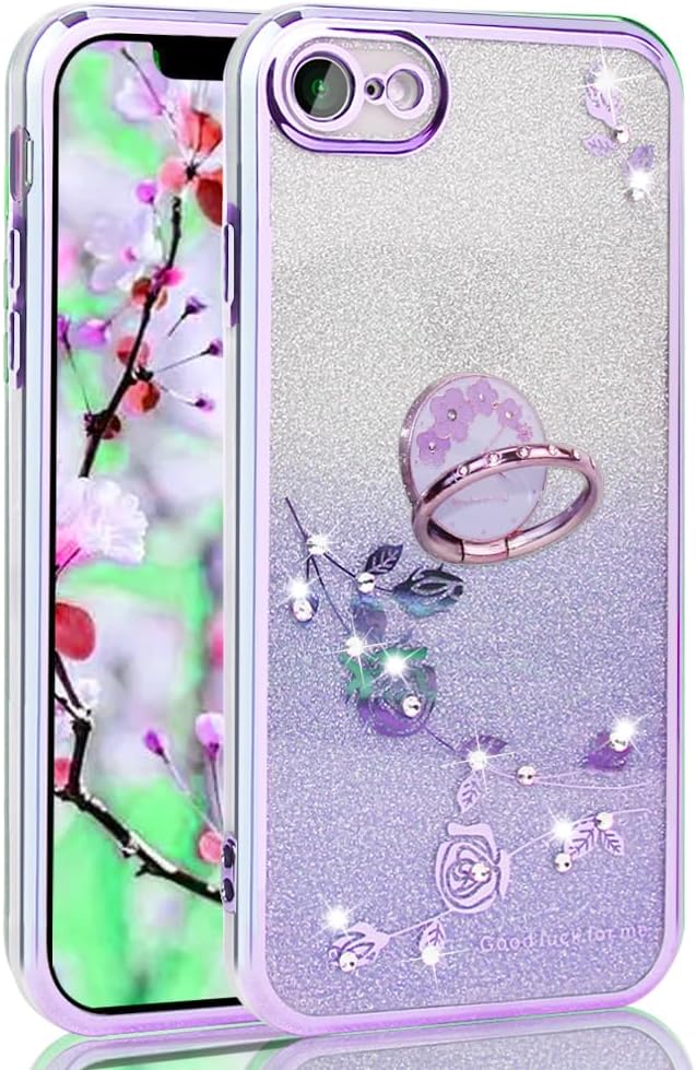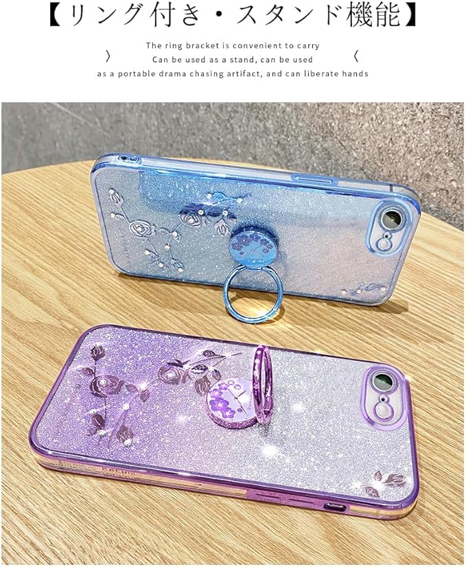 スマホケース 対応 iPhone 16e ケース リング付き クリア キラキラ メッキ加工 花柄 ソフトケース TPU 薄型 おしゃれ かわいい 衝撃吸収 ブランド アイフォン16e カバー (パープル, iPhone 16e)