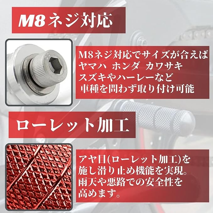 滑りにくい安定感 : ローレット加工により、滑りにくい設計となっており、足をしっかりと支えます。雨の日でも安心して使用でき、快適なツーリングをサポートします。CNC機械加工されたアルミ製のため、耐久性と軽量性にも優れています。