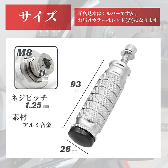 セット内容 : フットペグ 左右セット M8規格ボルト ワッシャー 長さ:81mm (エンドキャップ含む)、72mm (CNC本体のみ) 太さ:26mm ボルト径:8mm 素材 : CNC高強度アルミニウム