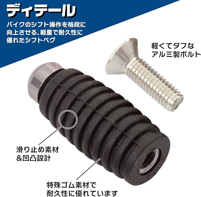 【高品質素材】凹凸があり、滑り止め効果のあるデザインのゴムを使用。大切な靴にぶつかっても傷が付きにくいラバー製で、ライディングを楽しむことが出来ます。また、航空機にもされている軽量かつ丈夫なアルミニウムを採用しているため、錆びにくく長くご利用いただける、フットペグとなります。