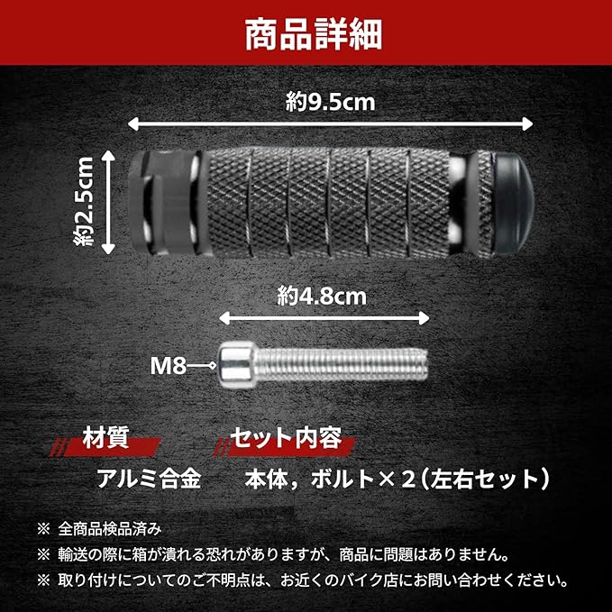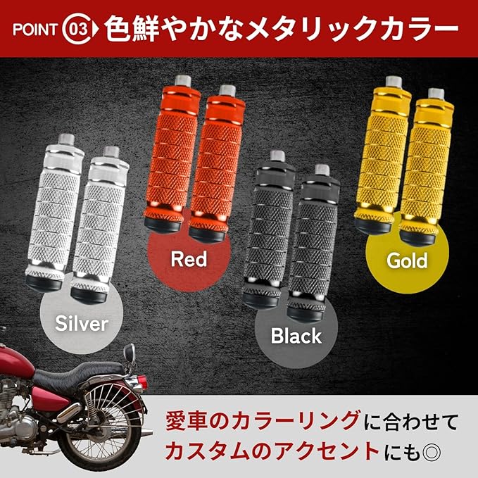 【あなたのバイクが生まれ変わる!】究極の快適性と洗練されたスタイルを纏う!汎用フットペグ 左右セット 「せっかくのツーリングなのに、足元が安定しない…」「もっとカッコよくドレスアップしたいけど、合うパーツが見つからない…」 そんな悩みを抱えるライダーの皆さんへ。 もう、妥協は不要です! ご紹介するのは、あなたの愛車の乗り心地と見た目を劇的に変える、ハイスペックな汎用フットペグです。車種を選ばない抜群の汎用性と、こだわり抜いたデザインで、走りの質とスタイルを同時にアップグレードします。