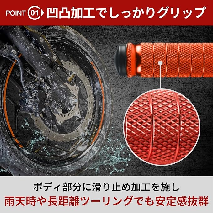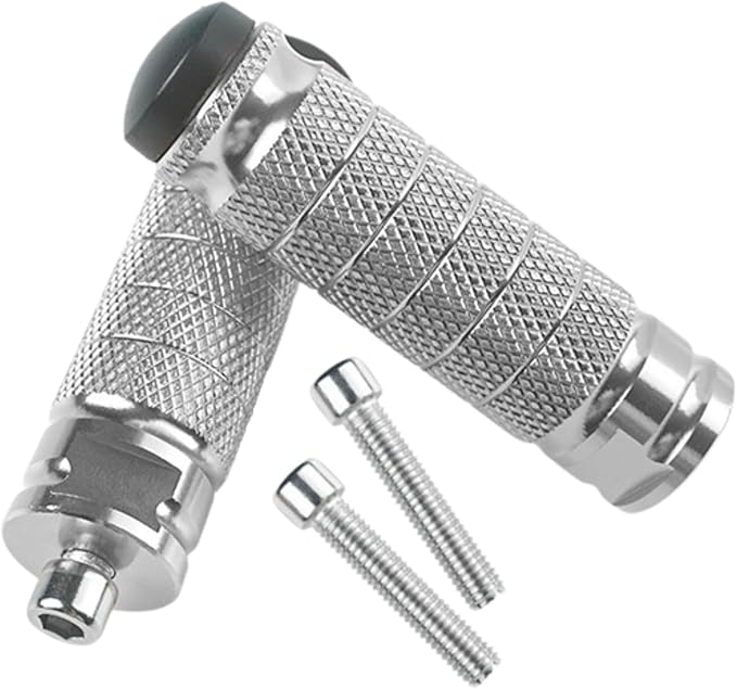 【危険回避!「雨でも滑らない」絶対的な安心感】 特に雨の日や悪路での走行中、フットペグが滑ると命に関わる危険も。このフットペグは、緻密に計算された「超滑り止め加工」を施しています。ウェットな路面でも、激しい振動の中でも、足元をがっちりホールドし、あなたのライディングを安定させます。長距離ツーリングでの疲労軽減にも貢献し、常に最高のパフォーマンスを発揮できます。 【目を奪われる「洗練されたデザイン」で愛車を魅せる】 機能性だけでなく、デザインにも徹底的にこだわりました。CNC加工によって削り出された高強度アルミニウムは、見る者を惹きつけるシャープでスタイリッシュな輝きを放ちます。どんなバイクにも自然に溶け込みながら、ワンランク上の存在感を演出。カフェレーサー、ストリート、アメリカン、ネイキッド…あなたの愛車を、さらに個性的にドレスアップします。