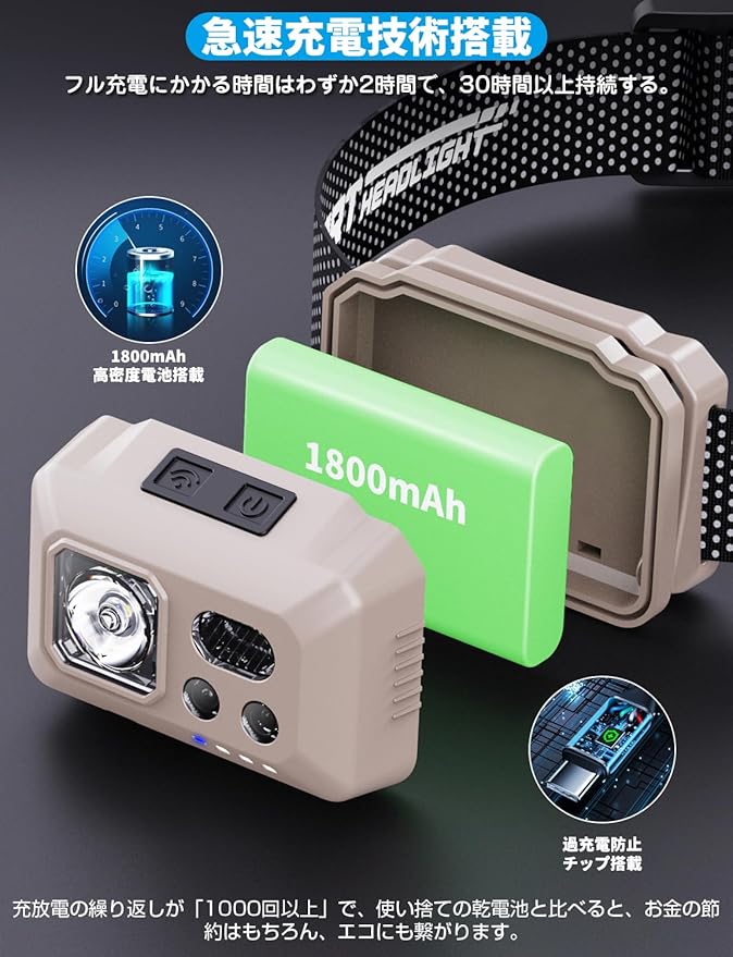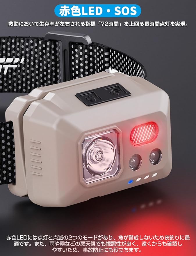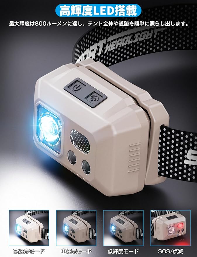 ヘッドライト Type-C充電式 大容量1800mAh 高輝度 LED 1000ルーメン 手振りセンサー機能付き 5種点灯モード 赤&白ライト SOS点滅 頭につけ ヘッドランプ 防水防塵 60 角度調整可 夜釣り 最適 登山 キャンプ 散歩 作業 釣り アウトドア 災害 停電用 小型 超軽量 ヘッド ライト