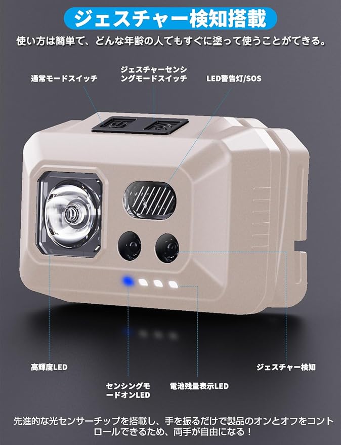 【手を振ることで作動するモーション】内蔵チップは、あなたの指示を感知して、いつでもオン・オフを切り替えることができ、両手を照明のために解放することができる。快適で調節可能なヘッドバンドが付属しているので、ヘッドランプを使えば、仕事、冒険、遊びに両手を自由に使える。
