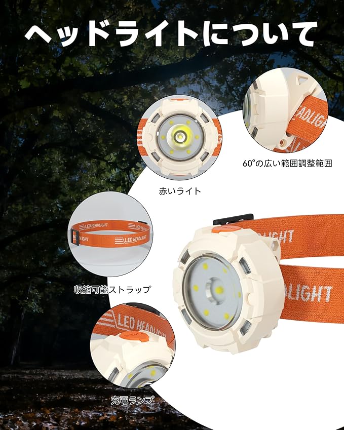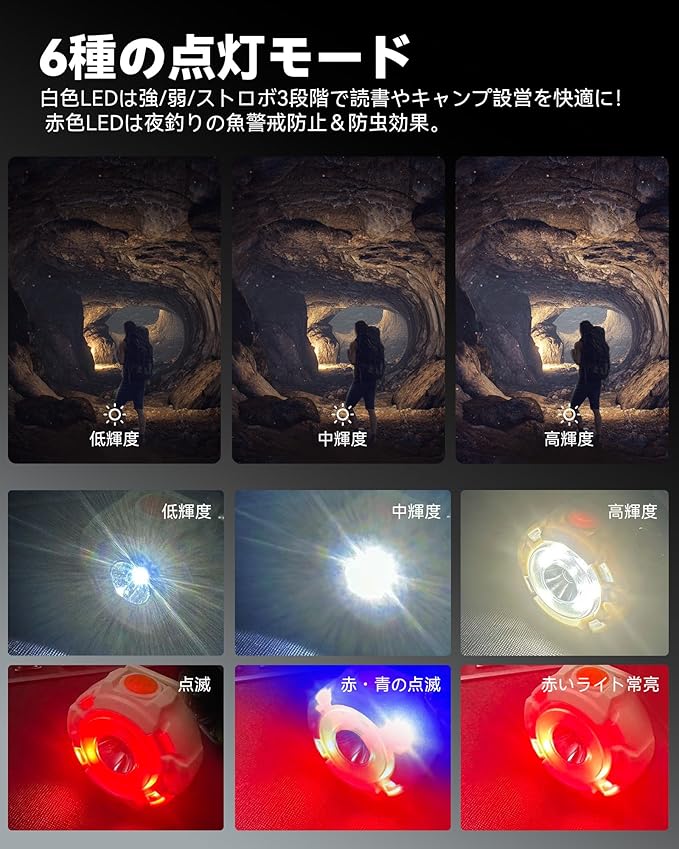 【IPX5防水&多用途】IPX5防水等級のヘッドランプ、大雨や霧中での作業、釣り、登山に完全対応! 超軽量34gでポケット収納可能、キャンプ、災害備品、夜間ジョギング、ペット散歩まで大活躍。