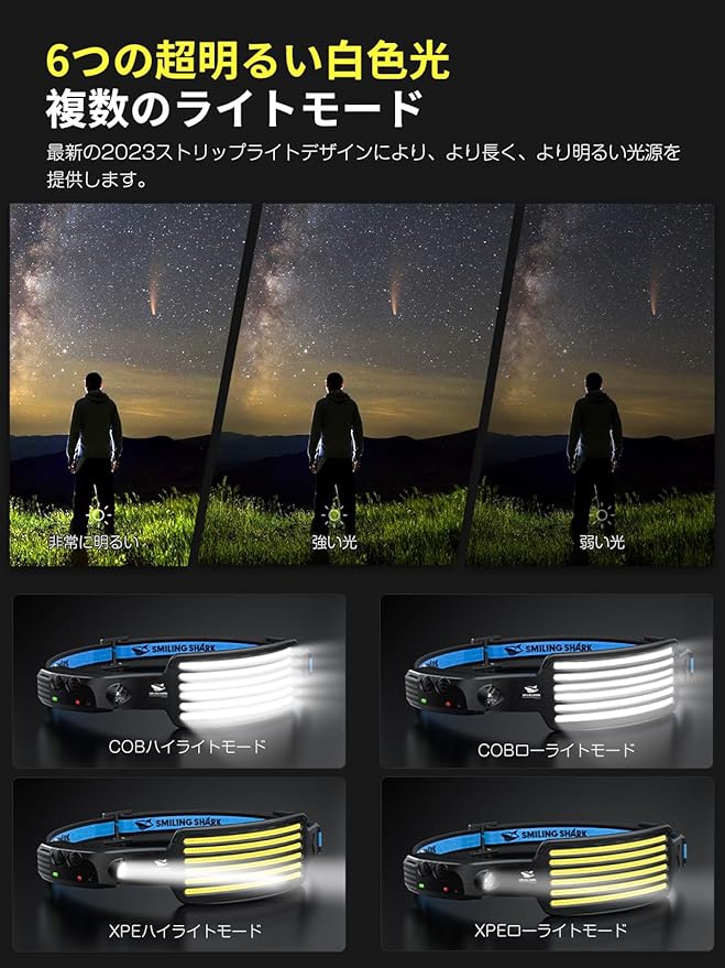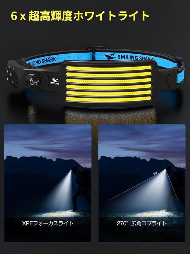 TD-0123 Smiling Shark LED ヘッドライト, 【2025年革新款・白光*6】 USB充電可能 6 倍高輝度アウトドアヘッドランプ 230 広角照明 集光 超軽量 IPX4 防水防塵 8時間連続使用可能 キャンプ 登山 散歩 釣り 作業 停電用 防災用 最適
