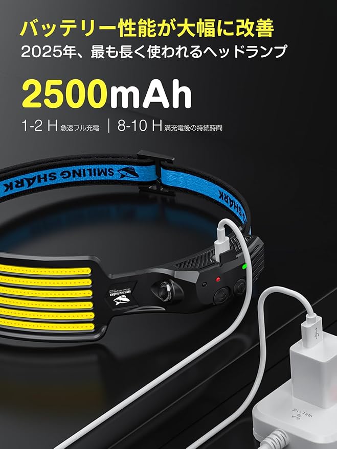 【超長時間連続使用】ヘッドランプは2500mAhのバッテリーで作動し、1回の充電で最大8時間の連続使用が可能。フル充電にかかる時間はわずか1~2時間です。
