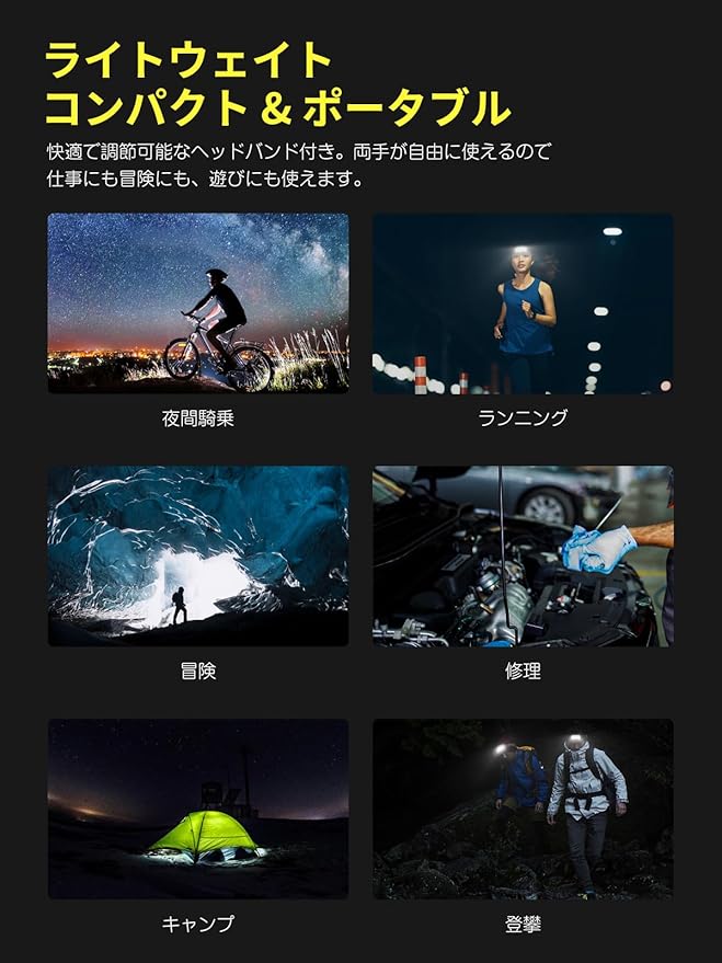 【夜間の活動に最適なパートナー】キャンプ、ハイキング、釣り、DIYなど、このヘッドランプはあらゆる夜間活動に最適な光を提供します。