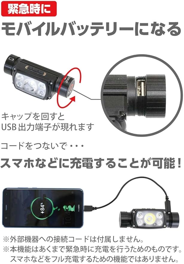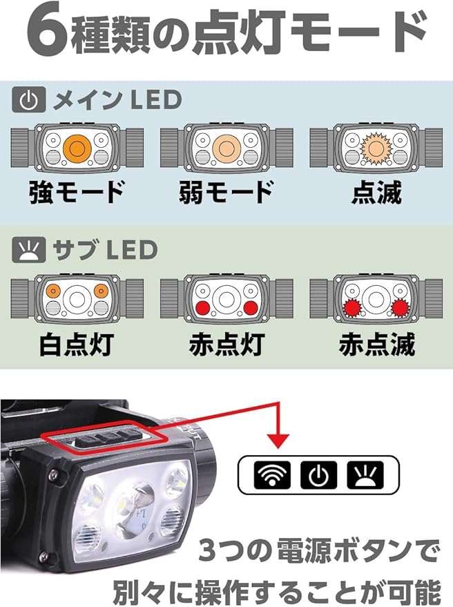 【製品仕様】明るさ:最大6,100lm、連続点灯時間:メインLED 強1時間・弱8時間、サブLED 白点灯 3時間・赤点灯 30時間、重量:153g(充電池込)、点灯モード:メインLED 強→中→点滅、サブLED 強→中→点滅、付属品:ヘッドバンド・ライト本体・ブラケット・説明書・充電池(18650)・電池スペーサー・単4乾電池用ソケット・充電ケーブル、保証期間:1年間、操作などお困りの際はお気軽にお問い合わせ下さい。説明書記載のメールアドレスから販売店にご連絡ください。営業時間 9:00~16:30 ※Amazonカスタマーサポートでは操作説明をしておりません。