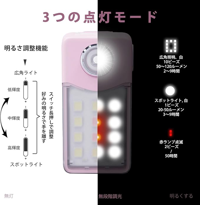 ✅【3モード切替&設定を忘れない!】 ワンボタンで「広く照らすライト」「足元スポット」「赤フラッシュ」を切り替え!10秒以上点灯後は押すだけでOFF。前回のモードを自動記憶するから、いつも使い慣れた光ですぐ使えます。