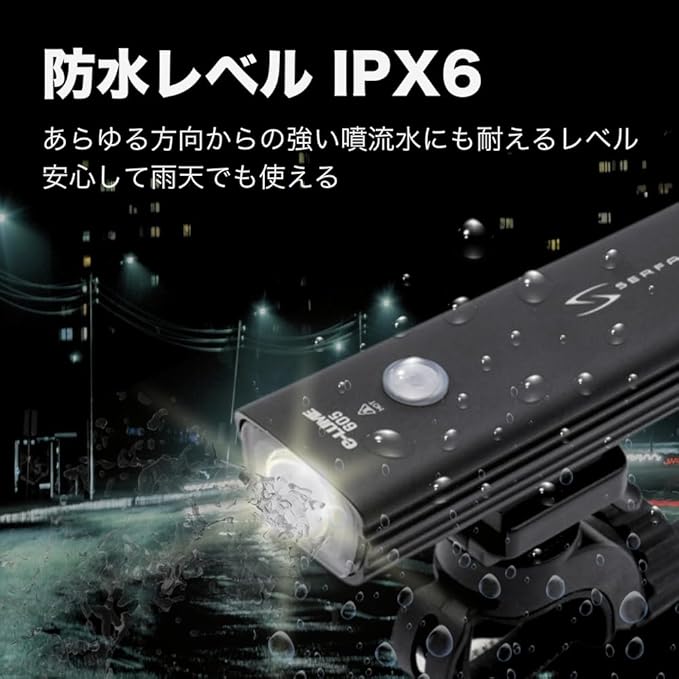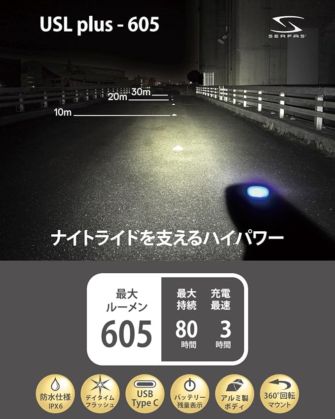 SERFAS(サーファス) 自転車用LEDヘッドライト USL PLUS Type-C充電式 IPX6防水 バッテリー残量表示付 吊り下げ可能