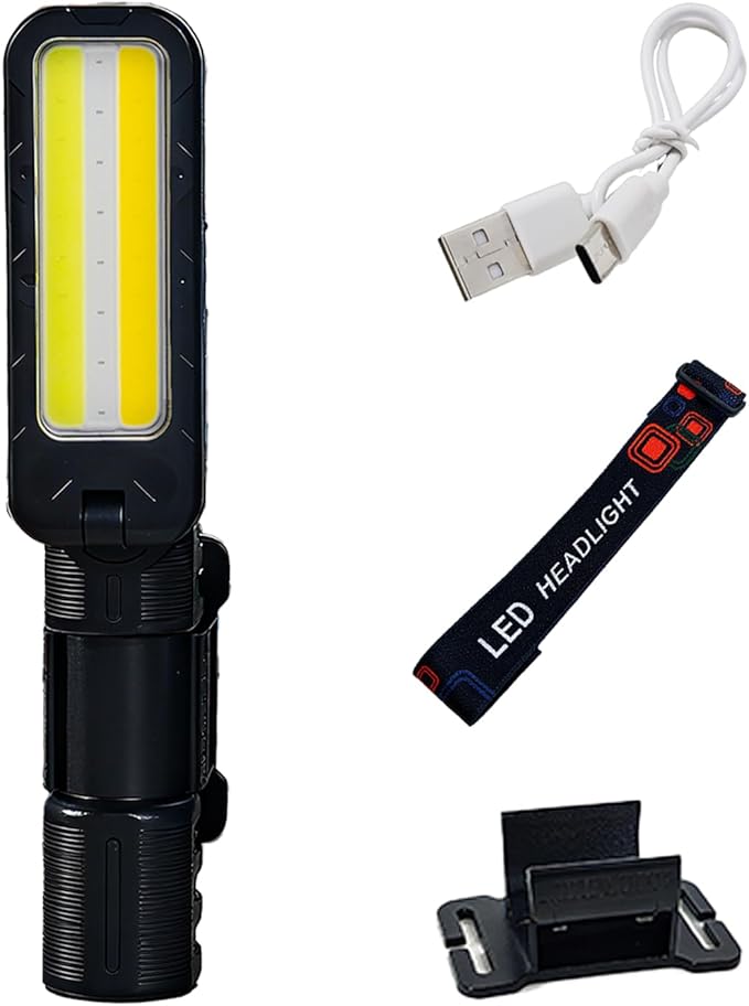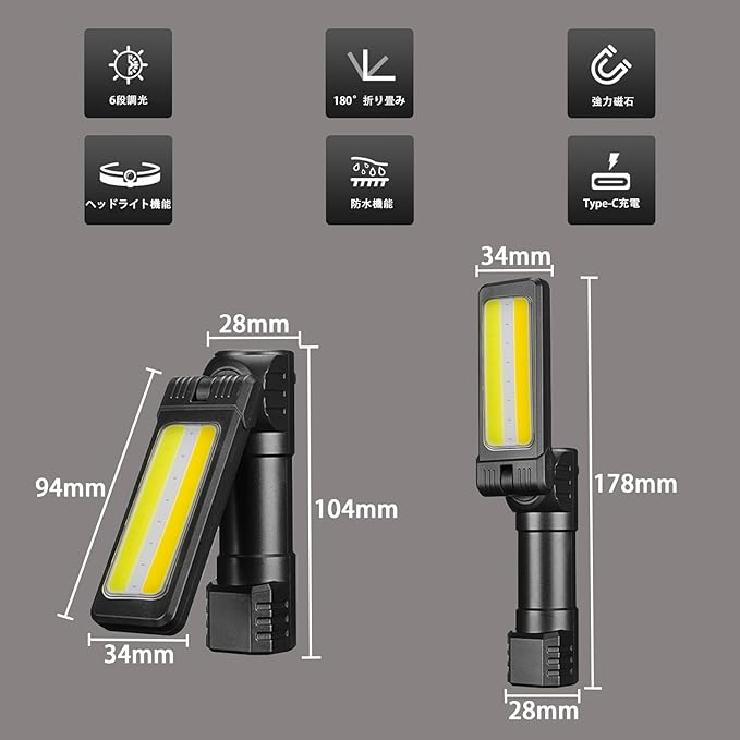 ワークライト LED充電式 COBライト 折りたたみ式 作業用ライト 6段階調光 小型LEDライト マグネット付き ヘッドライト 高輝度 防災非常灯 Type-C充電 アウトドア 防水機能 (1)