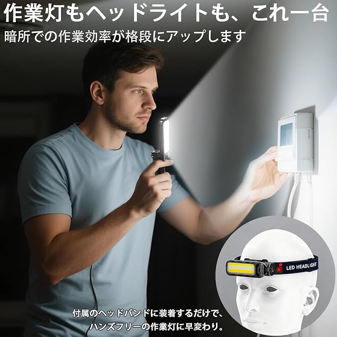 【高輝度COBライト】高品質なCOB LEDを採用で、広範囲を明るく照らす。従来のLEDより光のムラが少なく、均一で広い範囲を明るく照らします。暗所での作業や点検、アウトドアでもプロのような明るさを実現します。
