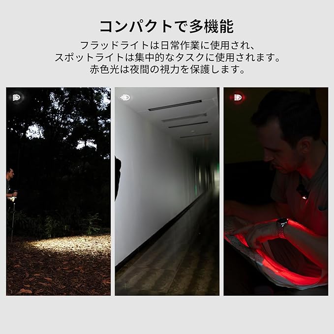 [3つの光源&多目的] Oclip Proはロービーム、ロー+ハイビーム、赤点灯という3種の光源を兼ね備えて、非常時には、ビーコンと赤色点滅モードを作動させ、位置信号や緊急警報を送ることができます。最大500ルーメンに出力して、照射距離最大約120メートルに達します。キャンプ、登山、ランニング、散歩、アウトドア作業、また家庭照明などに適しています