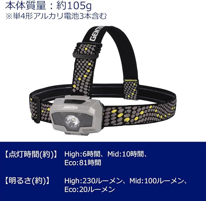 明るさ:High/230ルーメン、Mid/100ルーメン、Eco/20ルーメン、使用電池:単4形アルカリ電池 3本