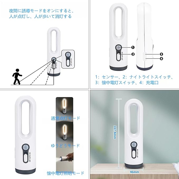 ナイトライトモード:スイッチをOFFにし、ランプを消灯します。 スイッチをONにして、ランプが点灯したままにします。スイッチをAUTOに回して、 ライトはモーションセンサーモードです。暗闇の中で人が近づくと、自動的に明るくなります。 人々が離れると、20 ~ 25秒後に閉じられます。昼間は機能しません。