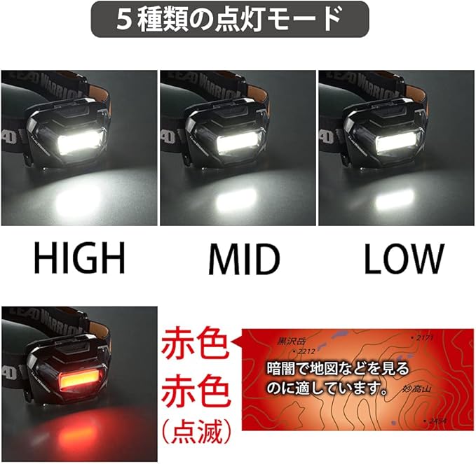 ● HIGH/MID/LOW/赤色/赤色(点滅)の5種類の点灯モードが選べます