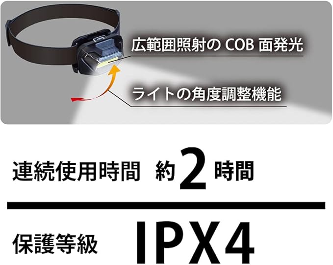 【 特 長 】● 明るさ300lmのLEDヘッドライト● 広範囲照射のCOB面発光● HIGH/MID/LOW/赤色/赤色(点滅)の5種類の点灯モードが選べます● 赤色LEDは暗闇で地図などを見るのに適しています● 連続使用時間 約2時間