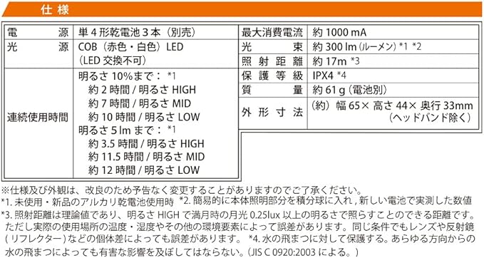 【 仕 様 】■ 電源:単4形乾電池3本(別売)■ 光源:COB(赤色・白色)LED(LED交換不可)■ 連続使用時間: ※未使用・新品のアルカリ乾電池使用時 ・明るさ10%まで 約2時間/明るさHIGH、約7時間/明るさMID、約10時間/明るさLOW ・明るさ5 lmまで約3.5時間/明るさHIGH、約11.5時間/明るさMID、約12時間/明るさLOW