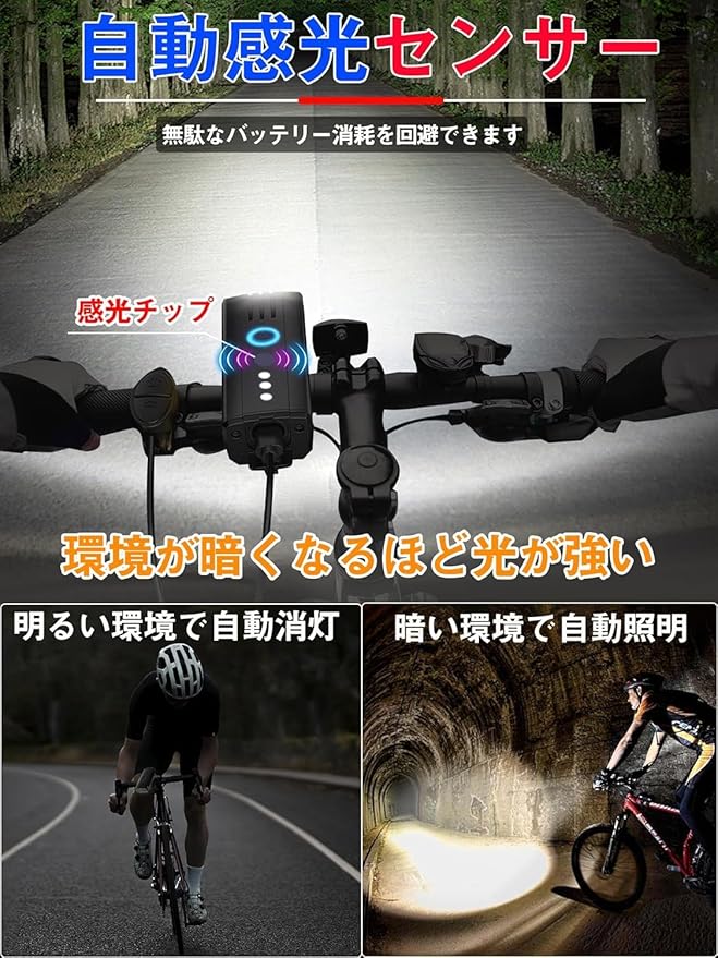 高輝度1000ルーメン LEDライトと光センサー自動点灯モード:環境光に応じて自動でライトの明るさを調整し、夜間の視認性を向上させます。1000ルーメンの高輝度で、長時間の使用が可能です。