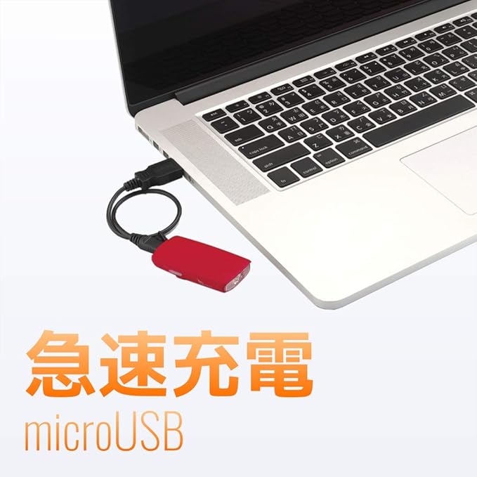 スイッチランプ:充電中 赤点灯、充電完了 消灯、電池わずか オレンジ点灯 付属品:充電用USB A-microBケーブル、取り付けブラケット、取扱説明書