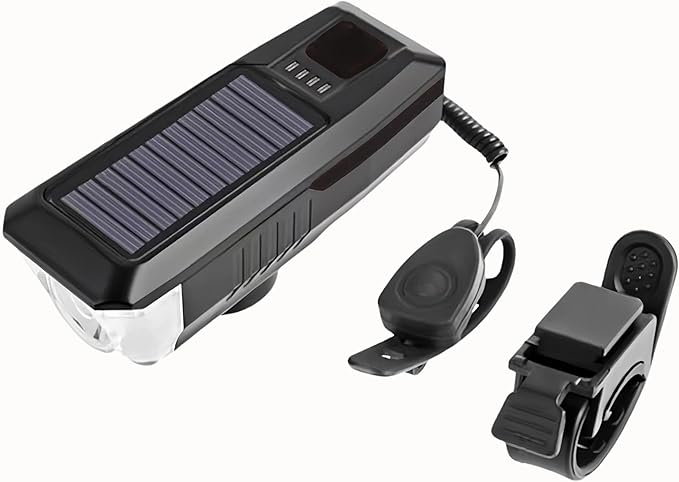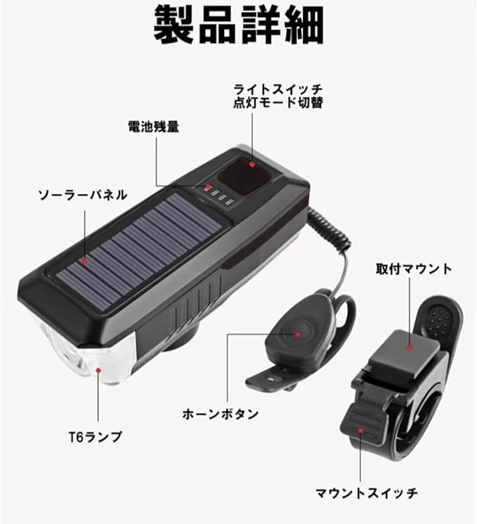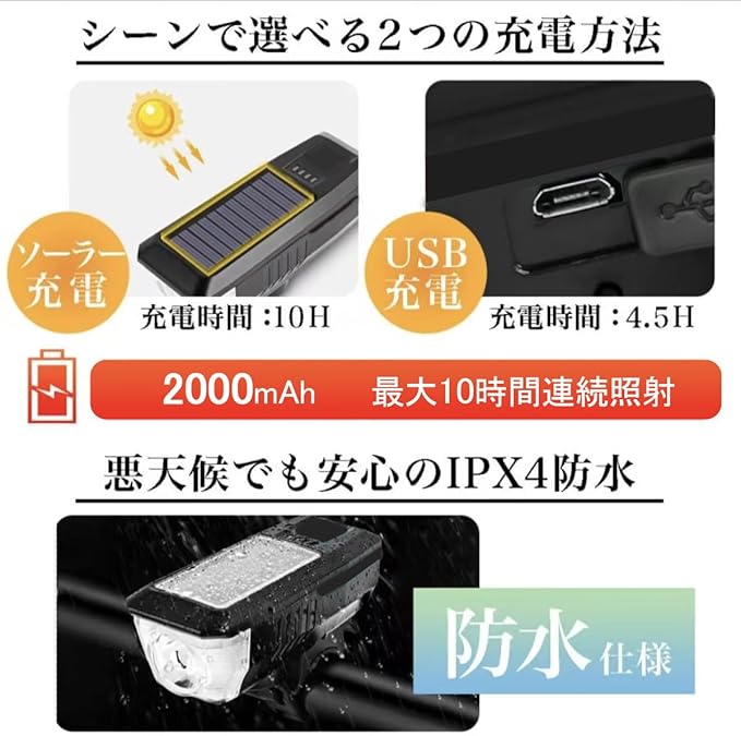 LED自転車ライト ホーン付き バイクライト USB充電+ソーラー充電式 LEDライト残量表示 自転車ヘッドライト 自転車電子ホーン