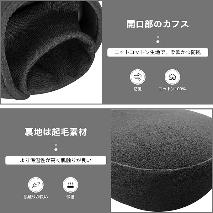 【保温性抜群】開口部のカフスは、冷たい外気がバイクハンドルカバー内部への侵入を防ぐために、伸縮性のあるニットコットン生地でできています。内部空間は広く、起毛の裏地と組合せると、操作が妨げられず、保温の効果が大幅に向上しています。