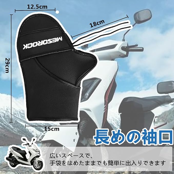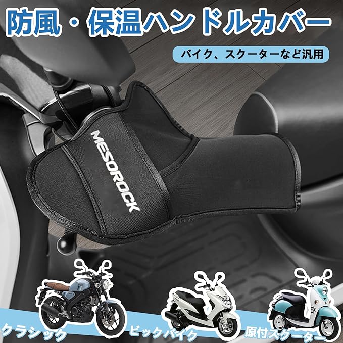 【ライディングの必需品】:撥水、防寒、防風仕様の温かいバイク用ハンドルカバーです。ミニバイク、スクーター、ビックバイクまで、幅広い車種に対応している汎用タイプなので、寒い時期の通勤・通学はもちろん、ツーリングで遠出する時にも便利に使えます。