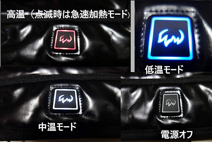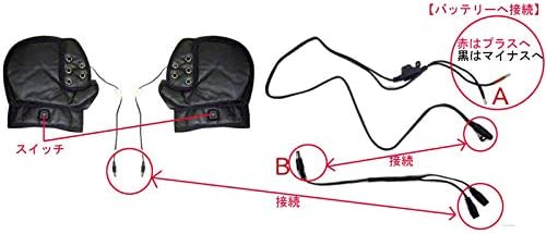 FS-JAPAN ヒーター付きハンドルカバー 保温、防風、撥水 機能満載のウインターアイテム。 汎用の高い設計!幅広い車種への装着が可能! グリップ交換不要!取り付け簡単! コントロールスイッチがハンドルカバー本体にありますのでスイッチの装着に困らない 寒い日にありがたい急速加熱モード装備 【操作方法】 両側のハンドルカバーにあるスイッチを押すと、電源がONになり、ハンドルカバー内に加温します。 電源ON: 赤ランプが点滅するまで、3秒ほどスイッチを押すこと。 電源OFF: パイロットランプが消えるまで、スイッチを押し続けること (約3秒間)。 階調整可能のLEDシリコン温度コントローラー搭載。 a. 赤ランプ点滅- 急速加熱 (電源ON,OFFにするたび、この段階になります。5分間後自動的に中温段階になります) b. 赤ランプ - 高温 c. 白ランプ - 中温 d. 青ランプ - 低音 いつでも温度調整可能:電源押すたび、温度設定を循環します。 使用後に、ランプが消えるまで、左右のスイッチを押して下さい。 ※自動遮電機能が搭載しないため、スイッチの消し忘れにご注意下さい※ 【本体素材】 表:合皮ポリウレタン 裏:特殊導電発熱繊維 間にスポンジを挿入。 【取付方法】 1. ケーブルAの端子をバイクのバッテリにつなぐこと。赤の端子をプラス側に、 黒の端子をマイナス側に接続して下さい。(写真の図をご参考に) 2. ケーブルAのもう片側をケーブルBに接続して下さい。引っかからないため、 余ったケーブルをバンドかテープで車体に固定して下さい。 3. ケーブルBのもう片側の端子を左右のハンドルカバーの本体に接続して下さい。 【ケーブル規格】20awg(30Ω 11.1V 4W) ※注意事項※ レギュレーターを改造した場合、バッテリー異常になりやすく、ハンドルカバーのヒューズが 切れるおそれがあります。 12V専用 6Vやバッテリーレス車両には取り付け不可 バッテリー容量が少ない場合は性能を発揮できない場合がございます。 シグナスX等、ミラー位置の関係でミラー軸がカバーの穴に取り付けできない場合がございます。