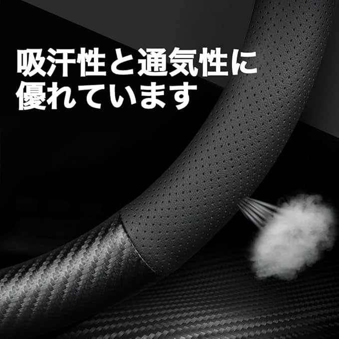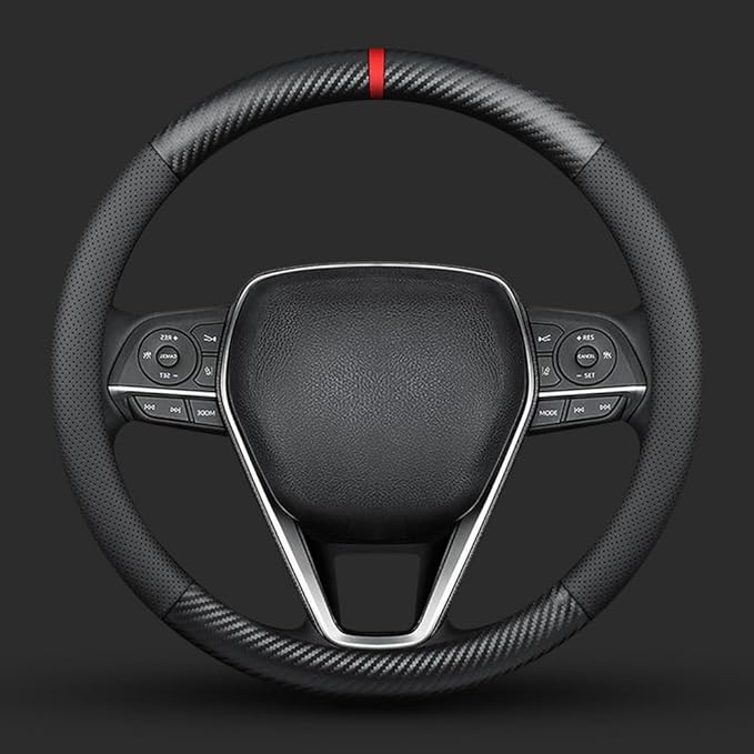 Carodi炭素繊維皮革自動車ハンドルカバー、快適滑り止め、汎用15インチ(黒+赤)